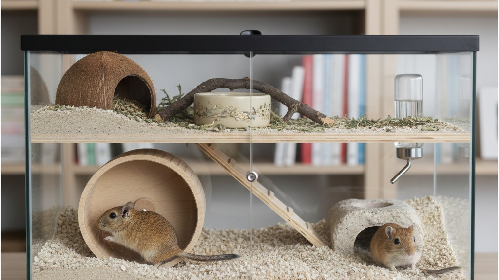 El hogar de tu jerbo debe ser espacioso y seguro. Se recomienda utilizar una jaula de vidrio o un acuario con tapa para evitar escapes y permitir una buena ventilación. La base debe llevar un sustrato absorbente como virutas de madera sin aroma o papel reciclado para facilitar la limpieza y evitar problemas respiratorios.