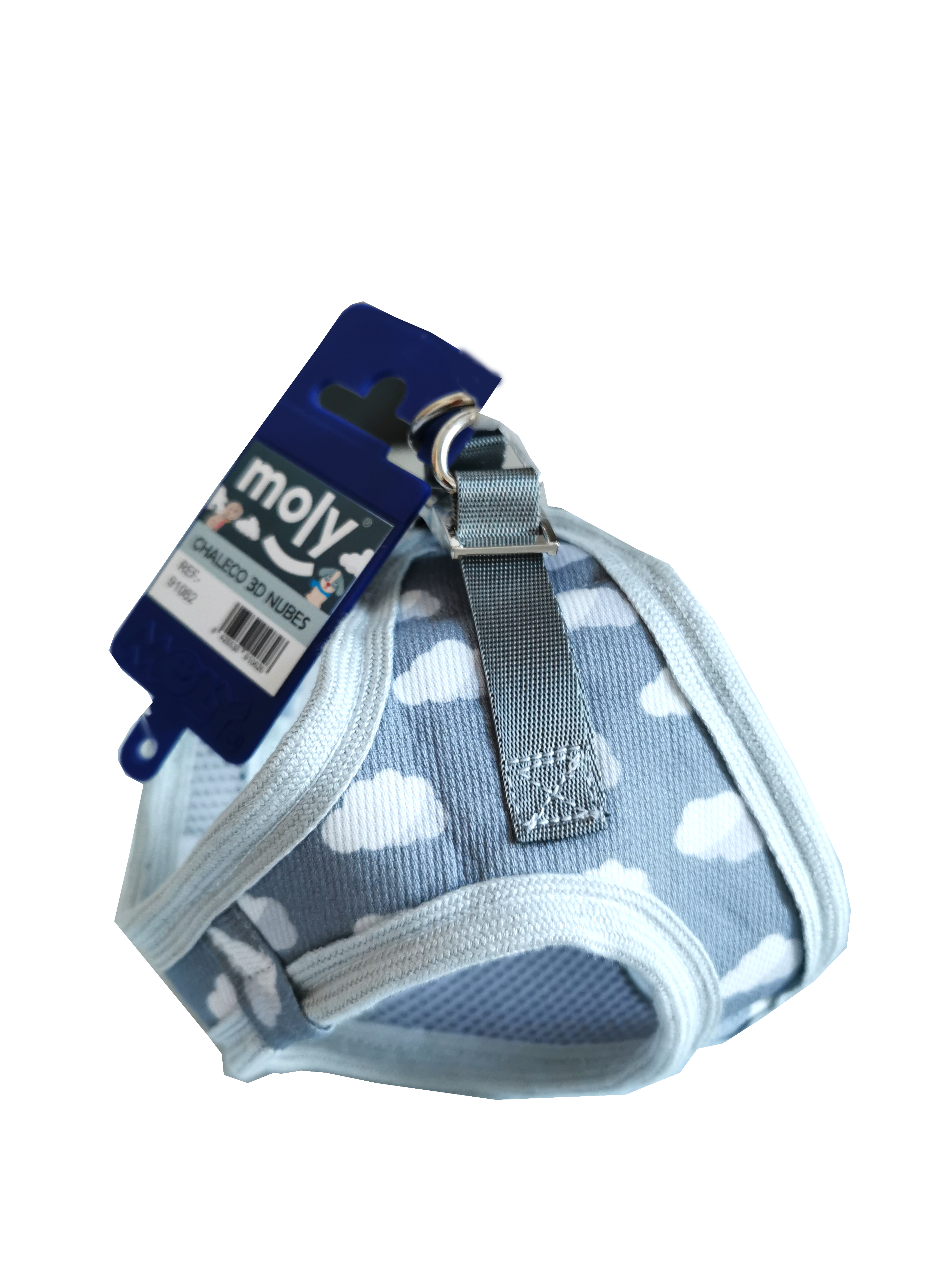 Chaleco 3D Nubes T-M fabricado en algodón transpirable, diseñado para adaptarse a las necesidades de temperatura de las mascotas. Incluye cierre metálico para mayor seguridad.