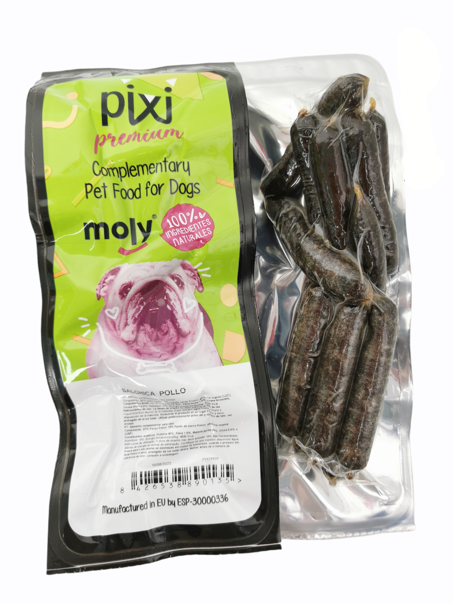 Las salchichas de pollo para mascotas son un snack de 7 cm, formuladas con 250 gramos de carne de pollo fresca, proporcionando una fuente natural de proteínas. Estas golosinas son fáciles de digerir, adecuadas para perros de todas las edades y tamaños. Su composición de ingredientes naturales asegura un producto de calidad, ideal para ser utilizado como premio durante el entrenamiento o como un aperitivo saludable. Además, su versatilidad permite incorporarlas en la alimentación diaria del animal, ya sea mezclándolas con su comida habitual o troceándolas para facilitar su consumo. Este producto contribuye al bienestar general de las mascotas, ofreciendo una opción nutritiva y sabrosa.